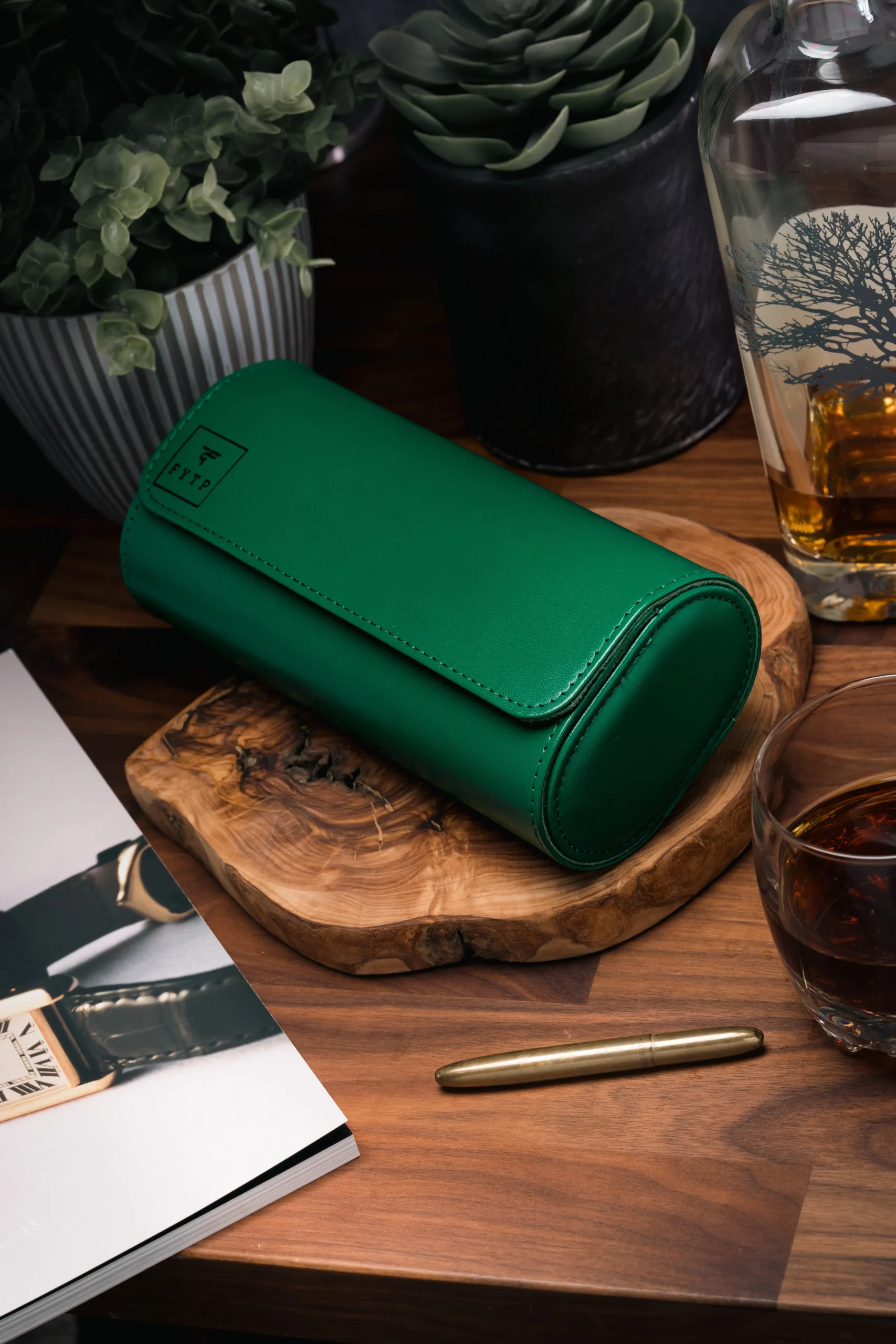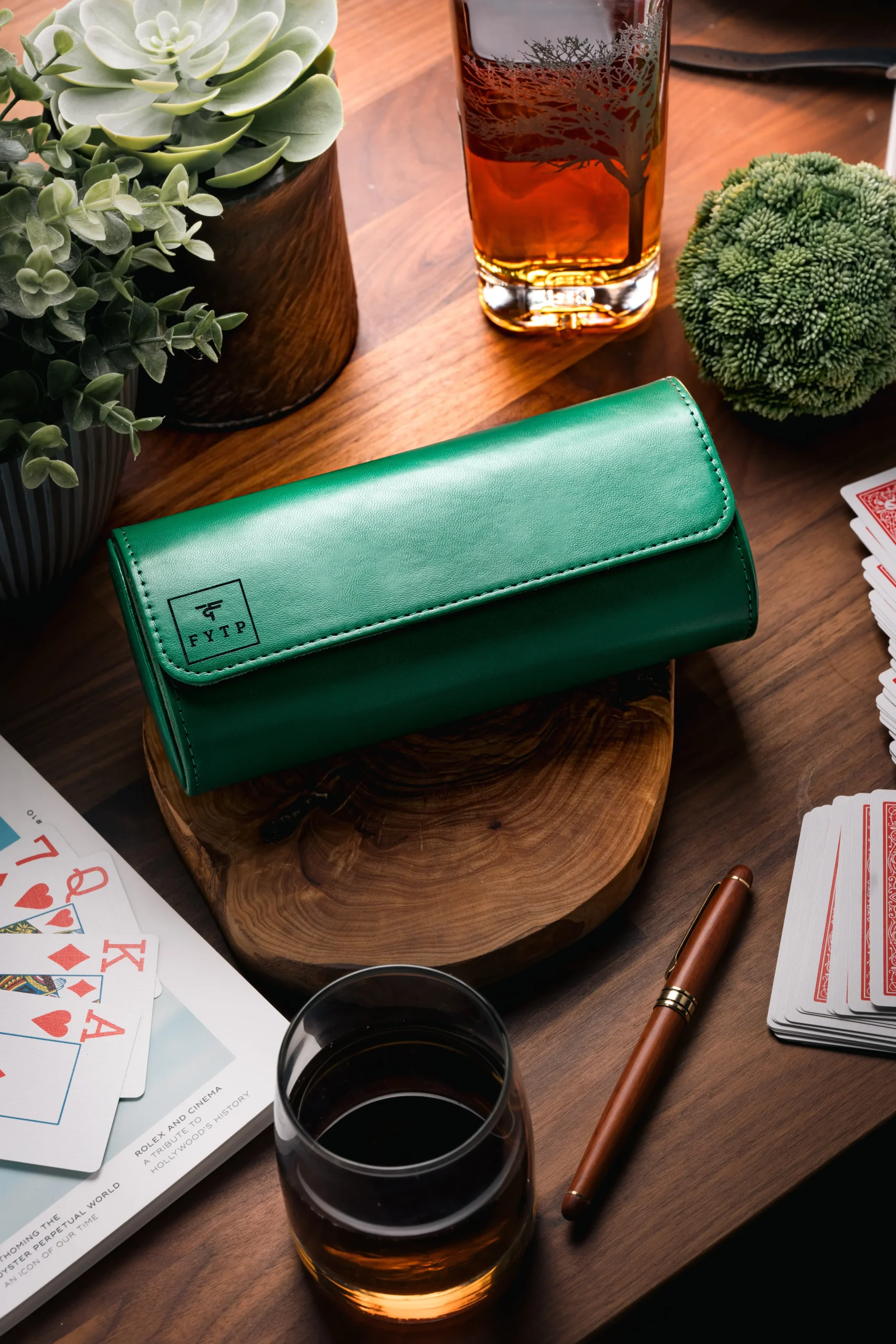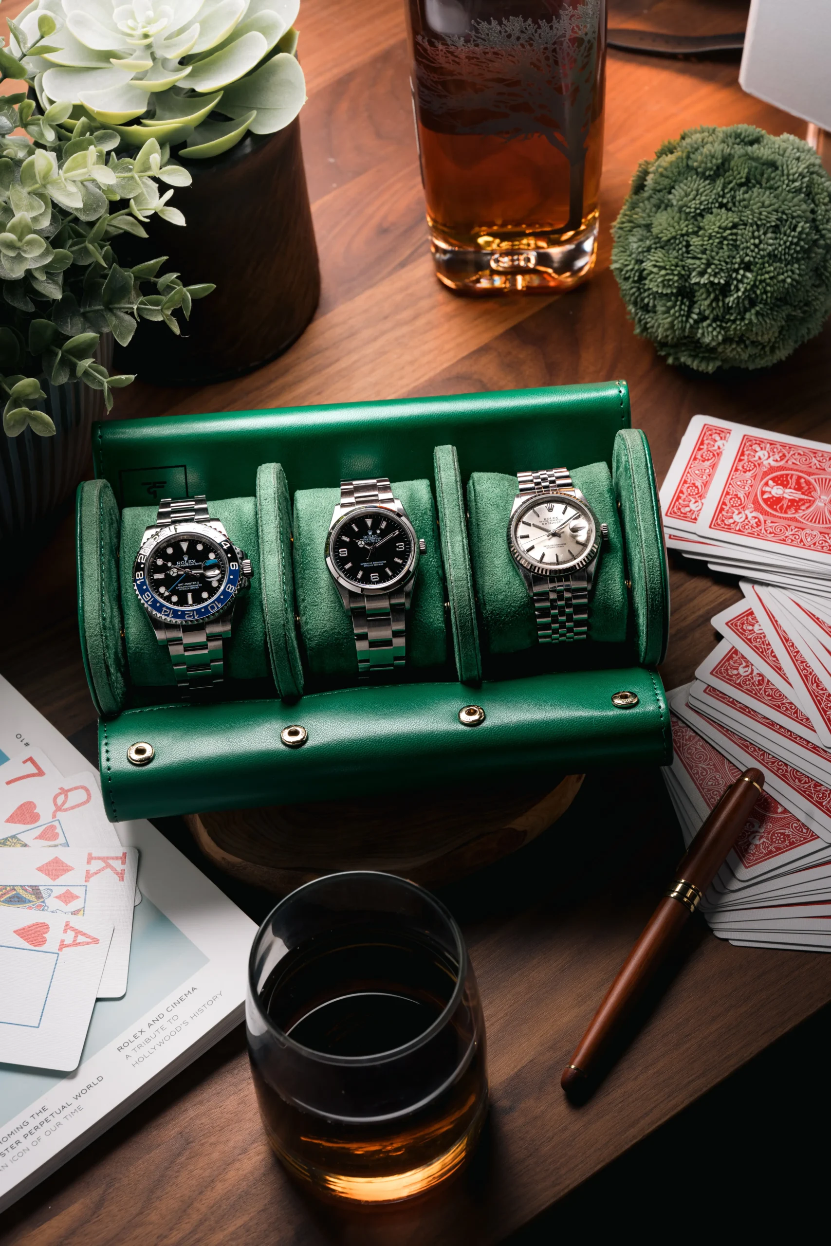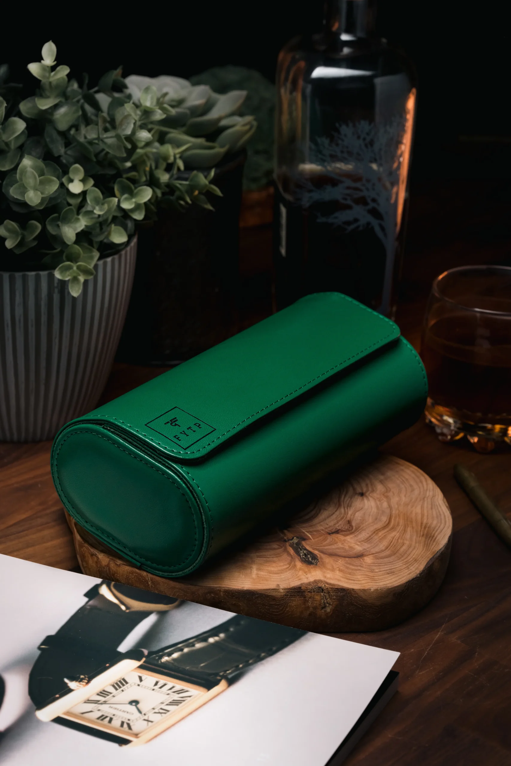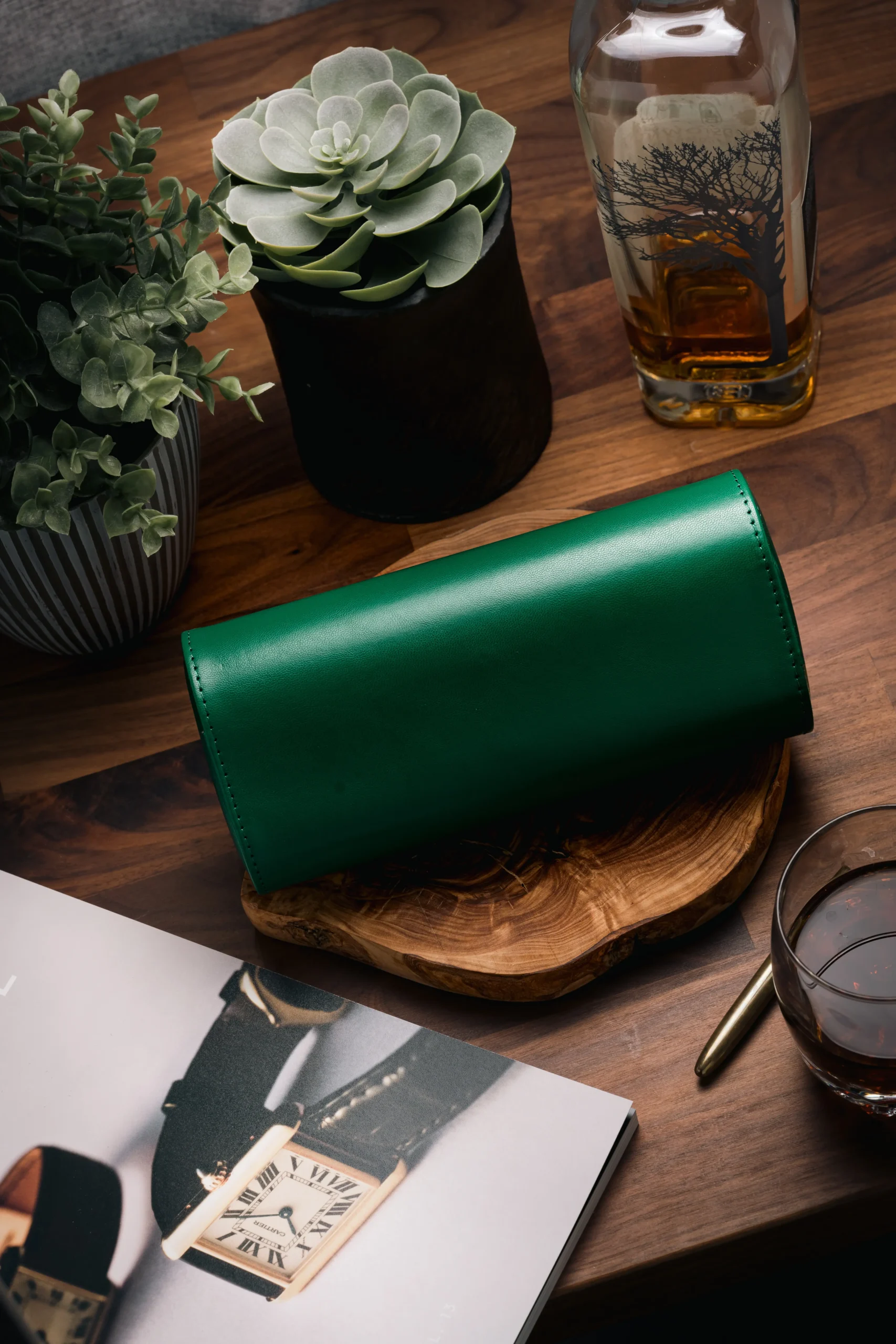 A bold and elegant triple-slot watch roll in green PU leather with suede interior and snap closure — customizable with name, initials, or logo.