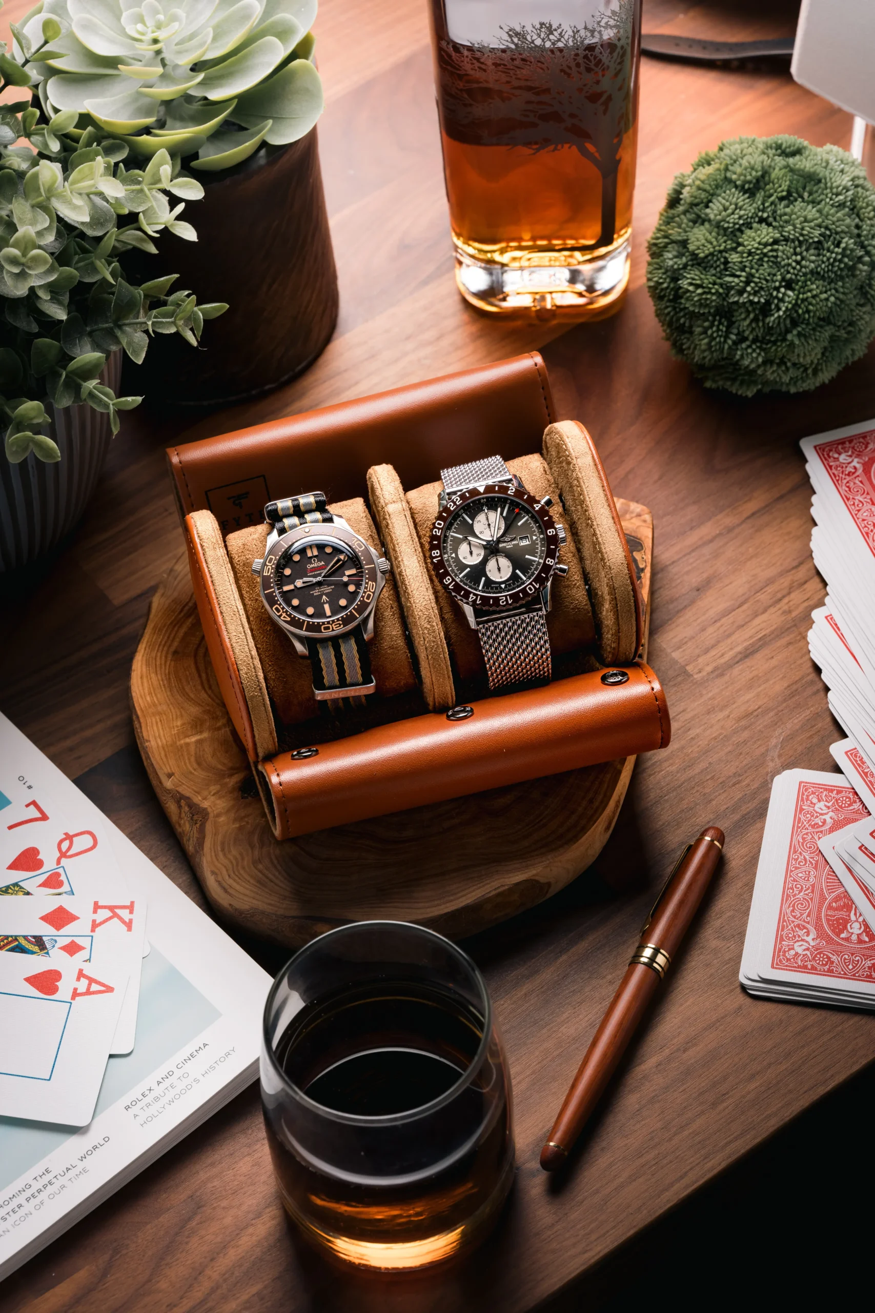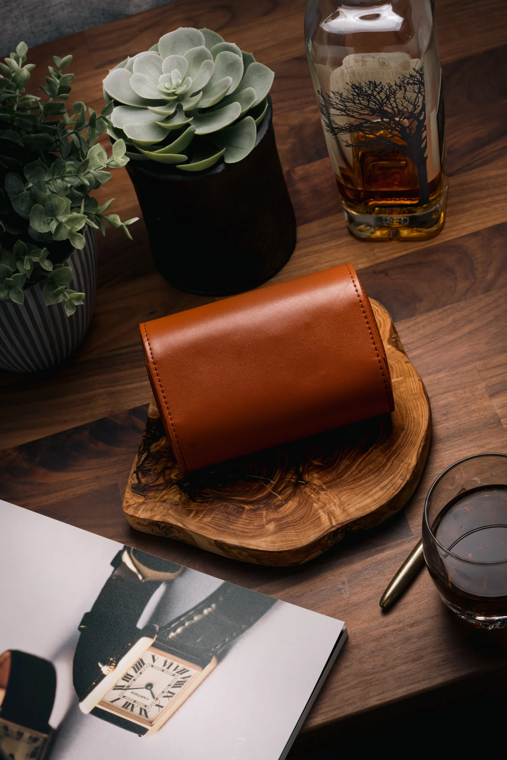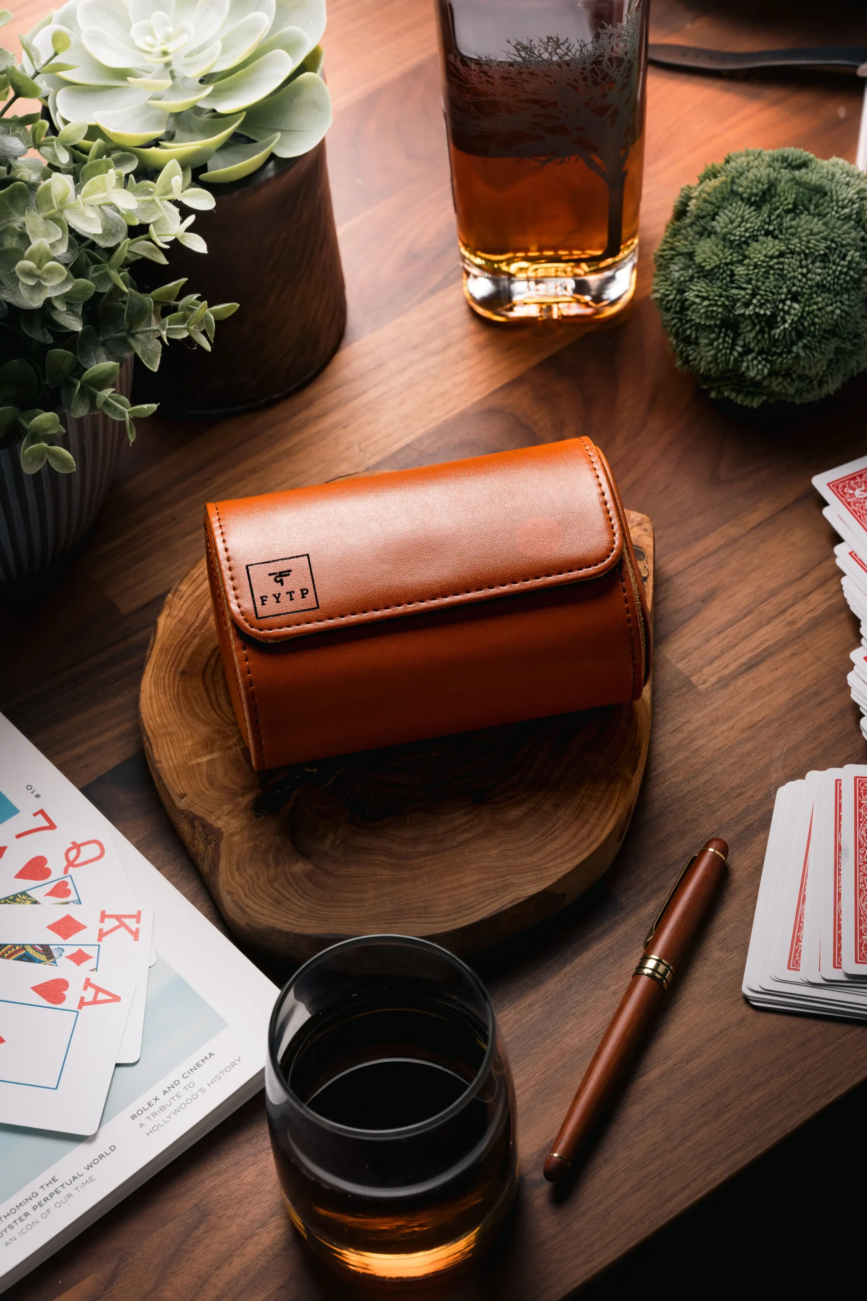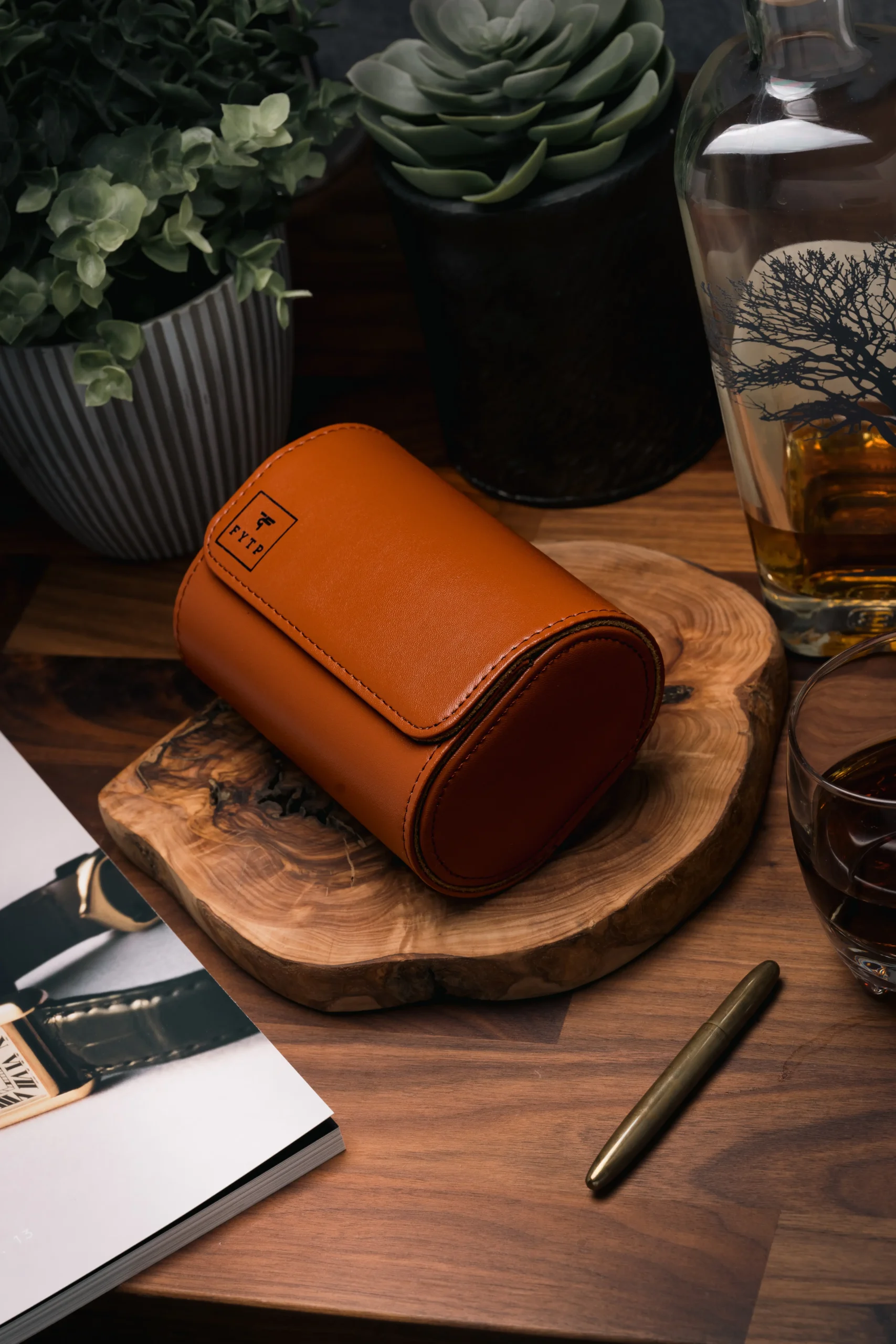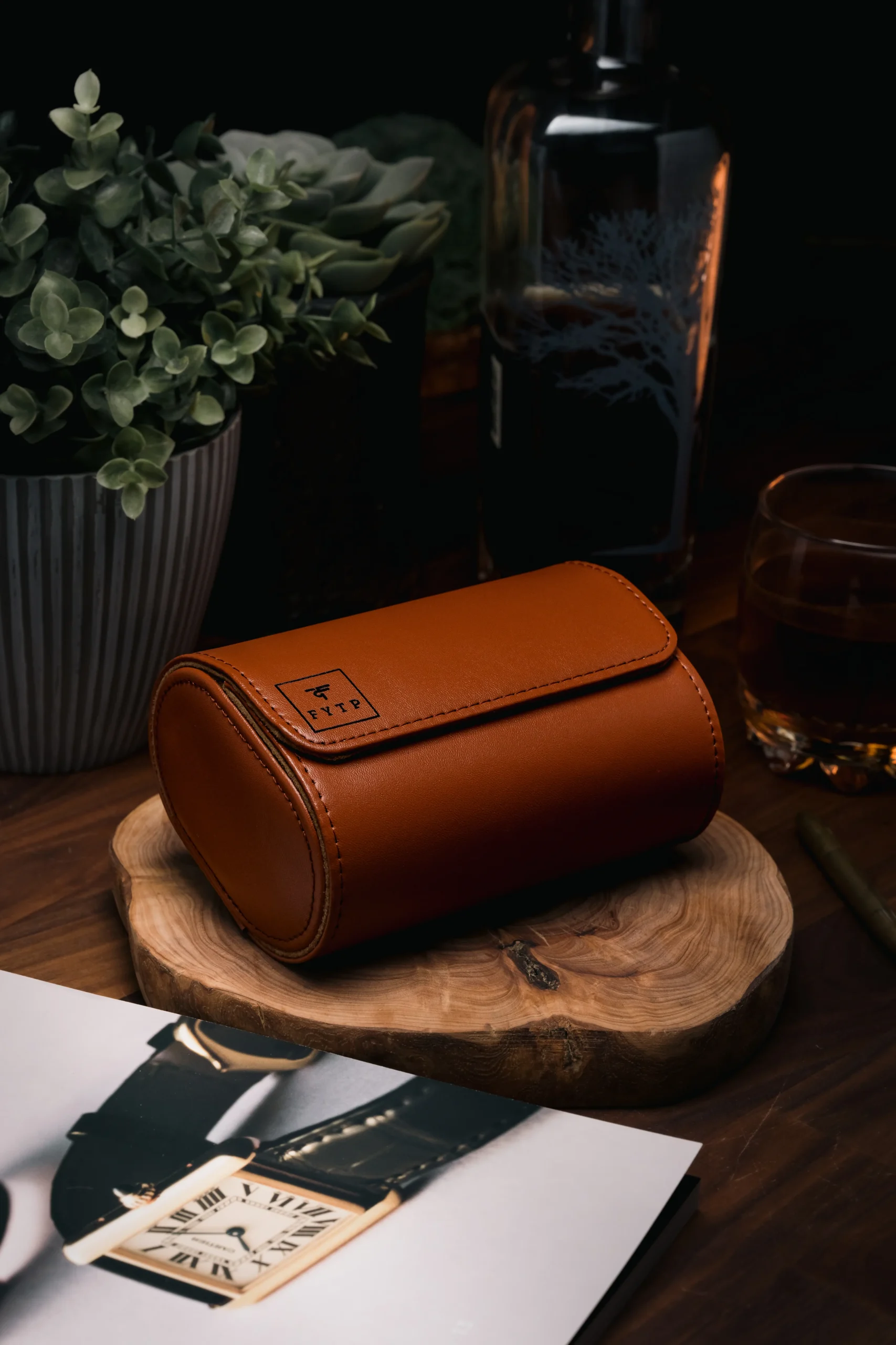 A bold and elegant triple-slot watch roll in light brown PU leather with suede interior and snap closure — customizable with name, initials, or logo.