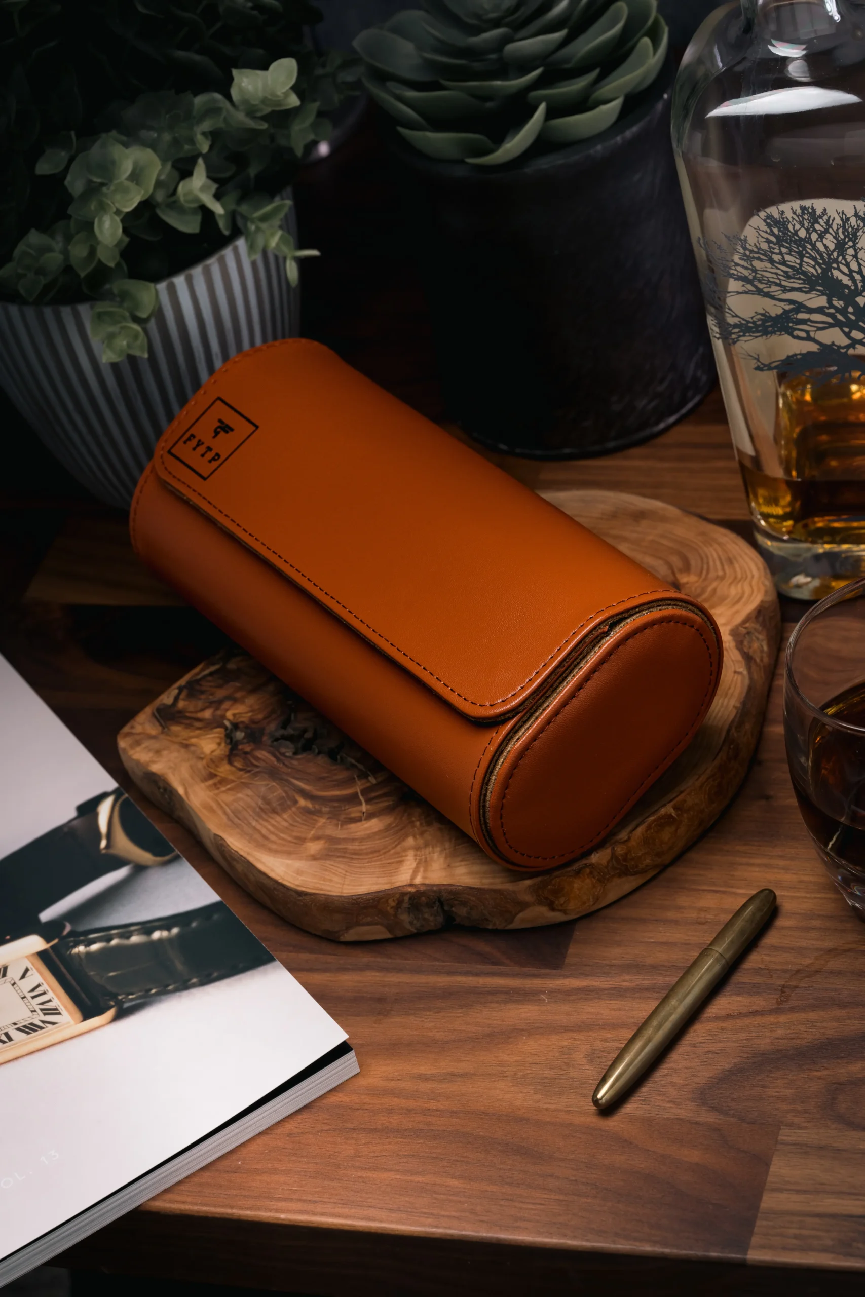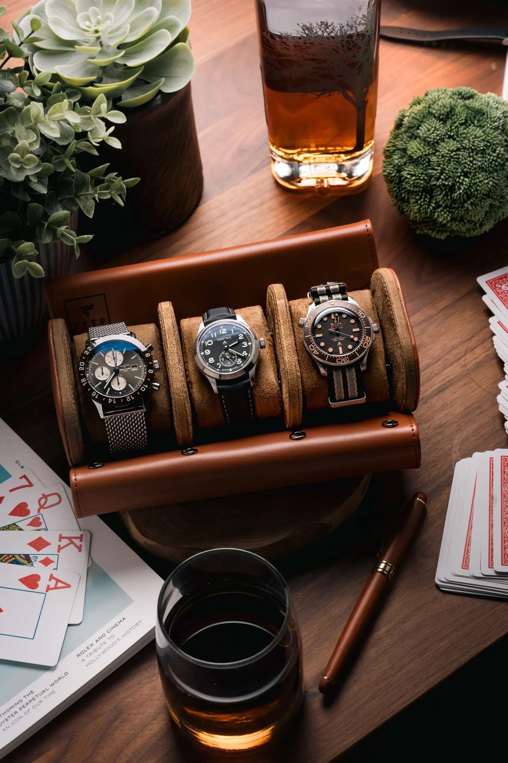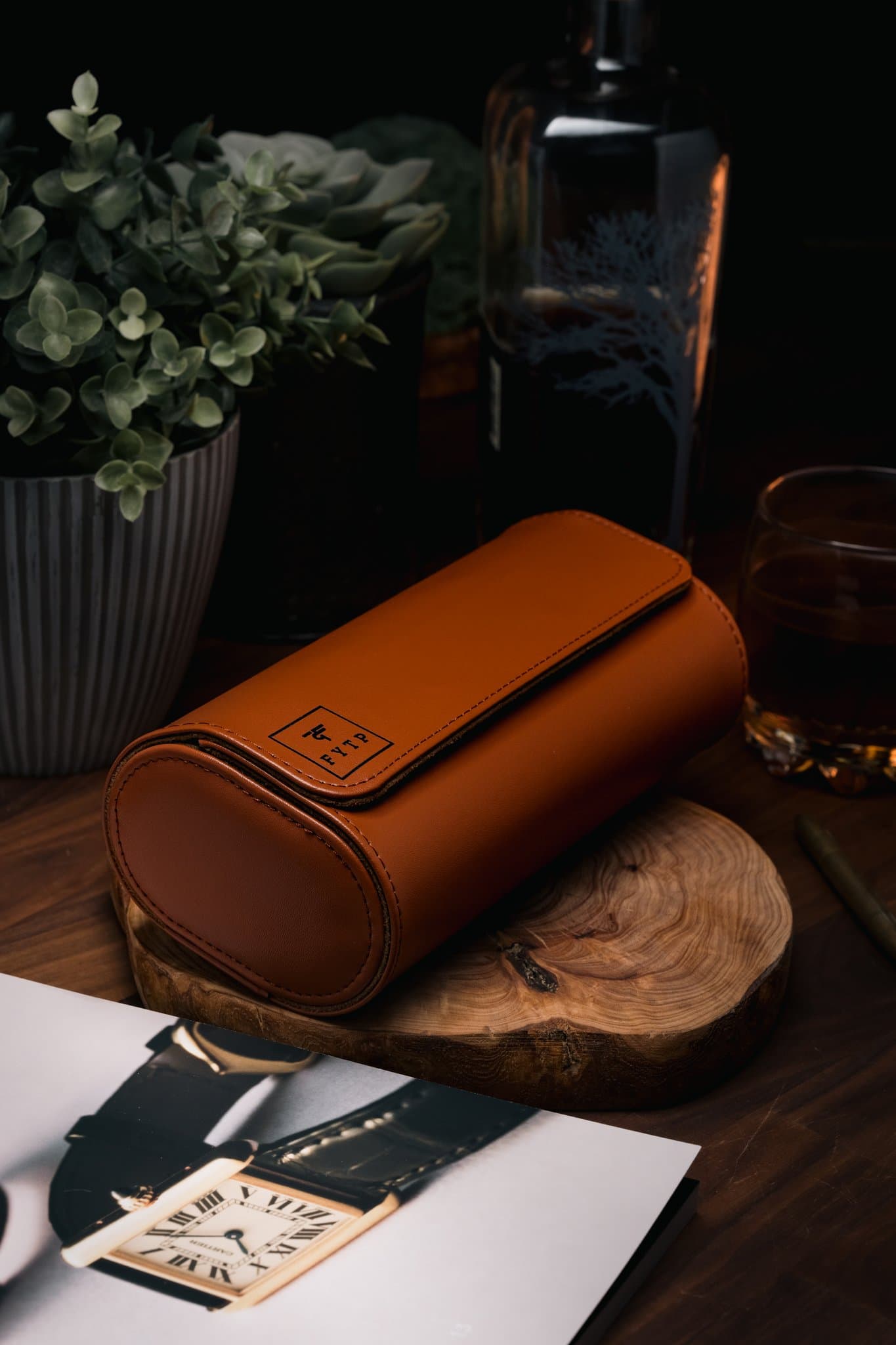 A bold and elegant triple-slot watch roll in light brown PU leather with suede interior and snap closure — customizable with name, initials, or logo.