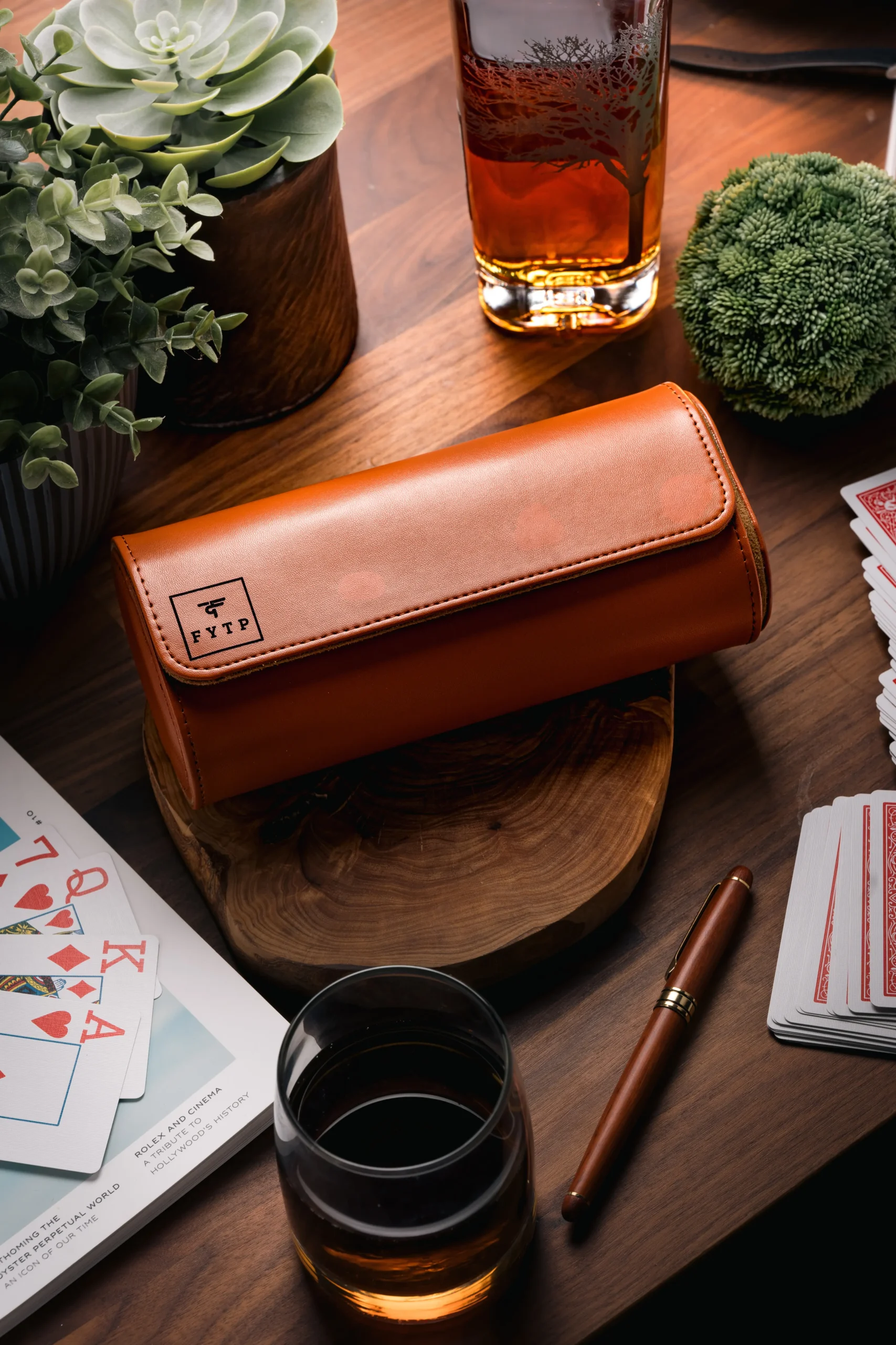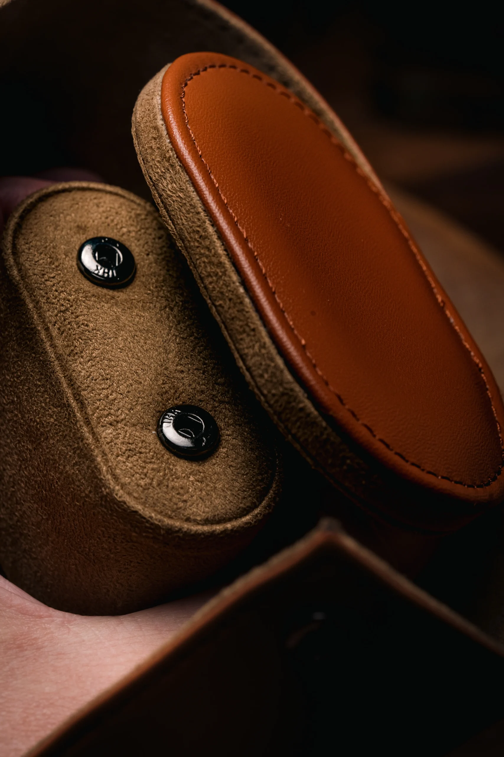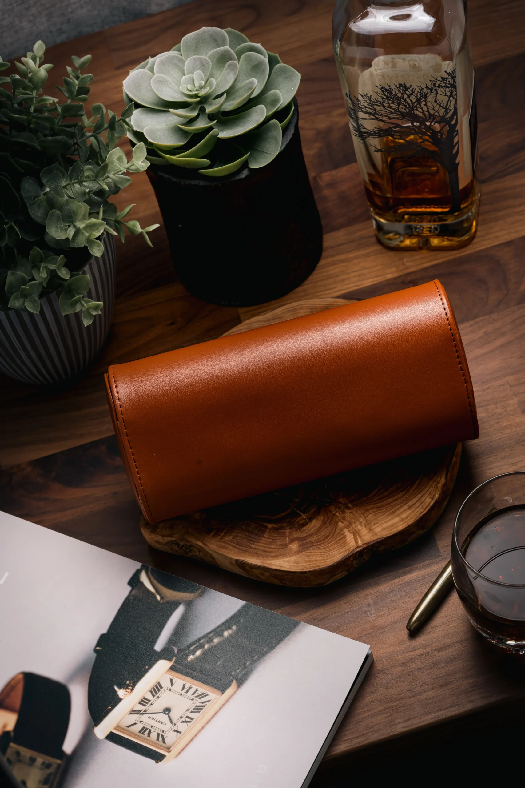 A bold and elegant triple-slot watch roll in light brown PU leather with suede interior and snap closure — customizable with name, initials, or logo.