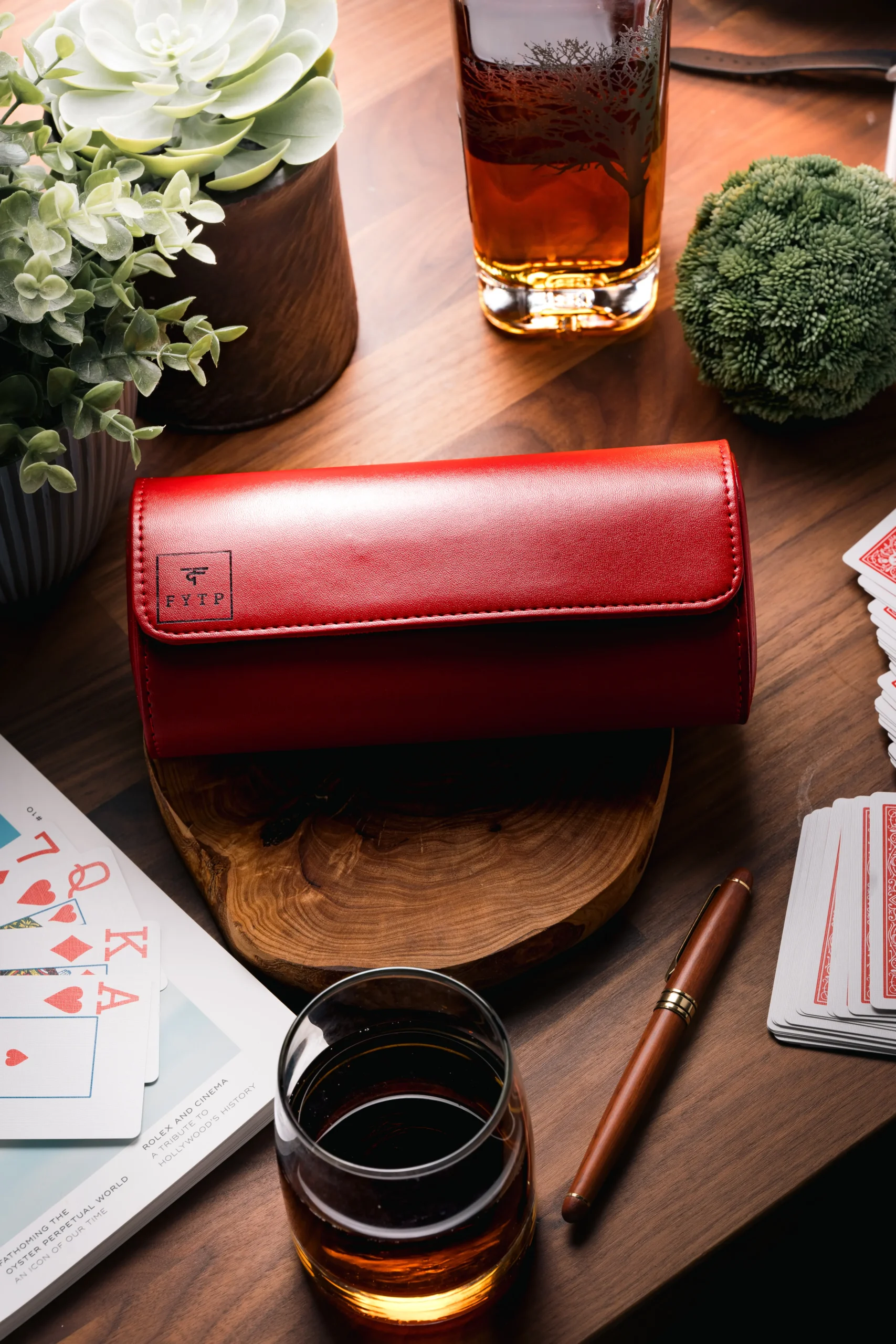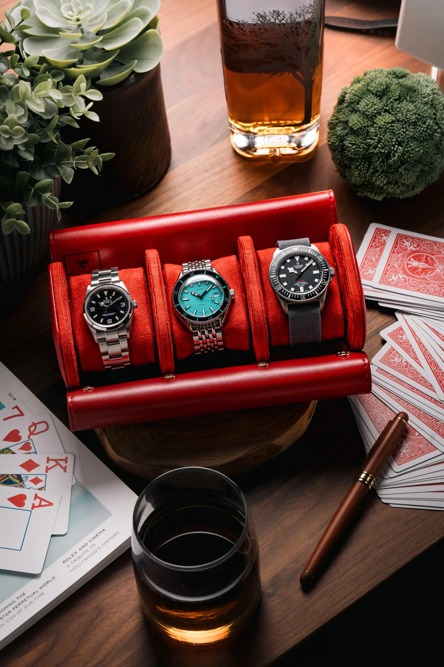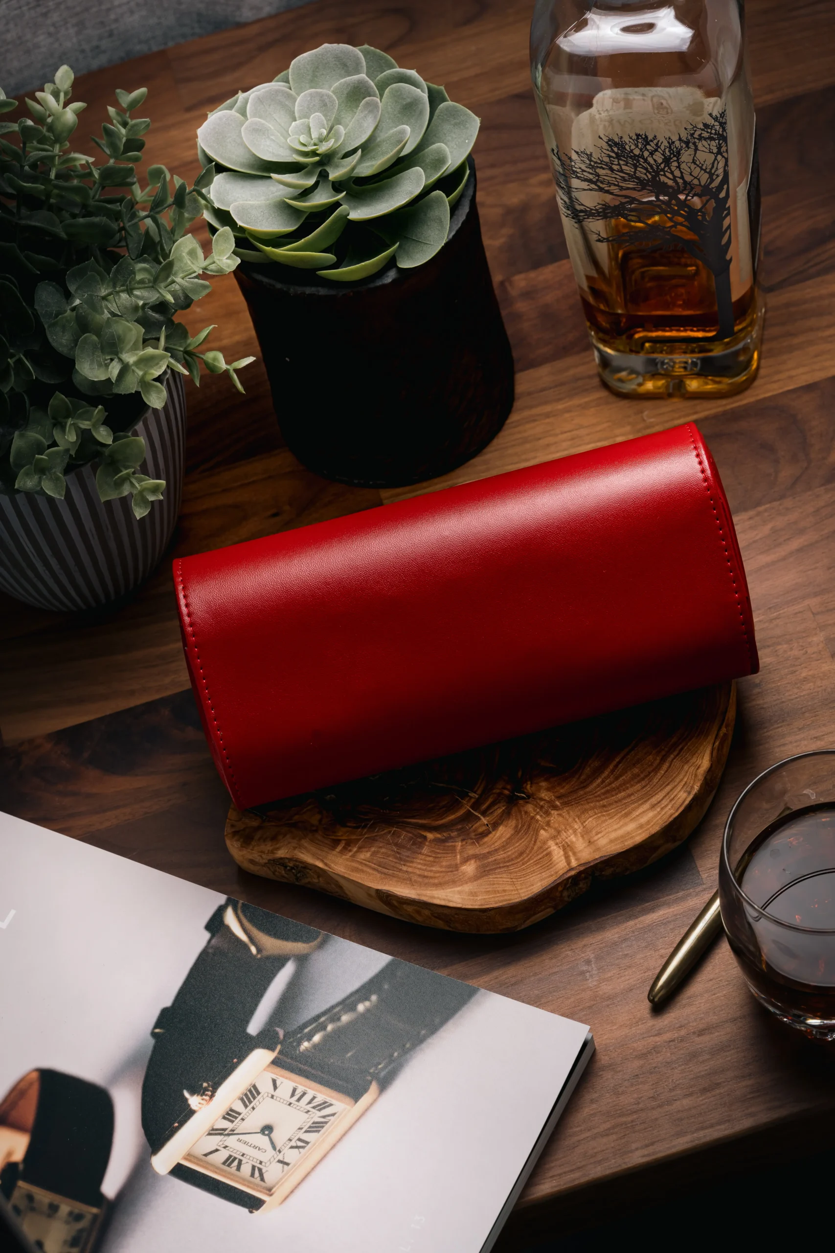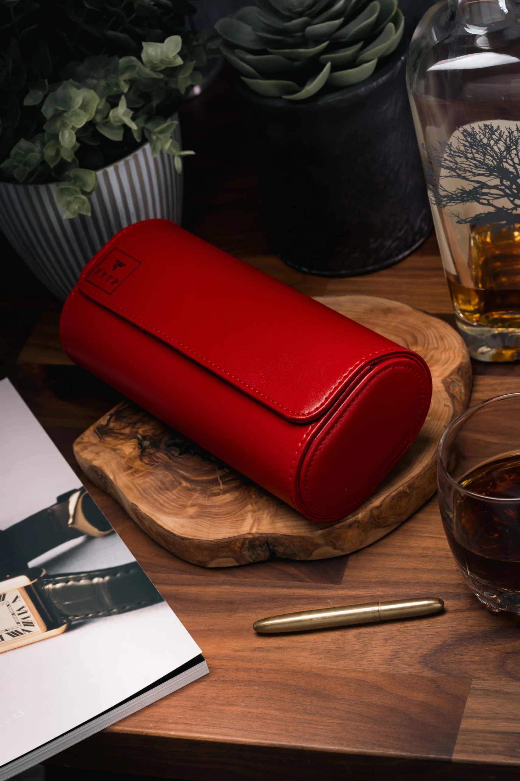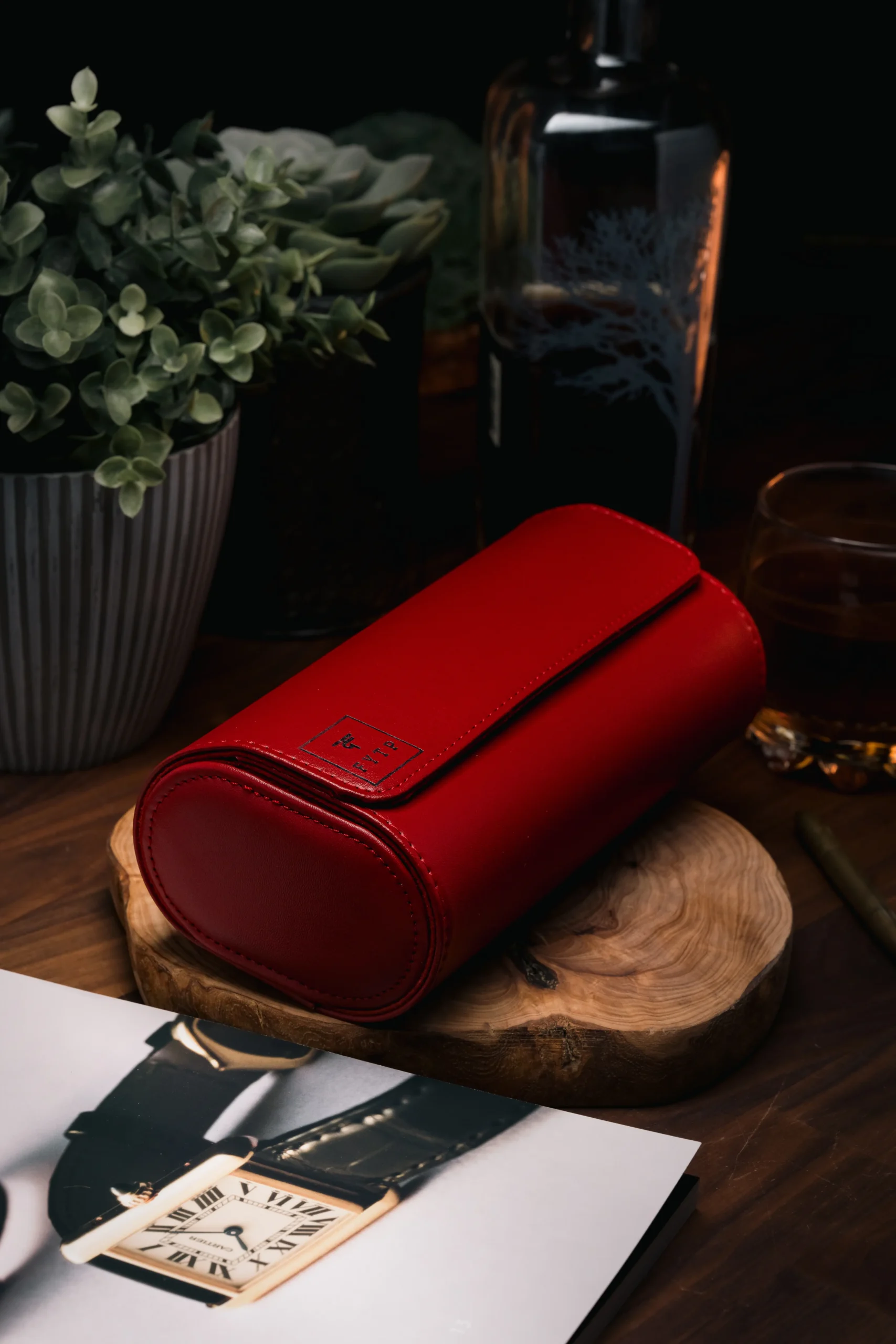 A bold and elegant triple-slot watch roll in red PU leather with suede interior and snap closure — customizable with name, initials, or logo.